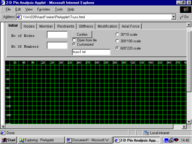 Above module was available at our testing site www.members.tripod.com/truss_designer. Since then working on Design capability was started. At this stage necessity of application was realised, due to file handling problems. Then previous applet was converted into application and standard file handling features were implemented for the data input files. During the conversion the GUI appearance was also completely changed in order to facilitate design of fairly complex and large structures. Similarly section database file was also implemented. Afterwards complexities in the loading combinations were taken into account. After finishing required features this application was converted into the applet, after modifying the file handling parts little bit. Now it is available in two flavors as Java application and applet. Here after when module was mentioned it refers to both application and applet. To check the results of this module Pin package was used.